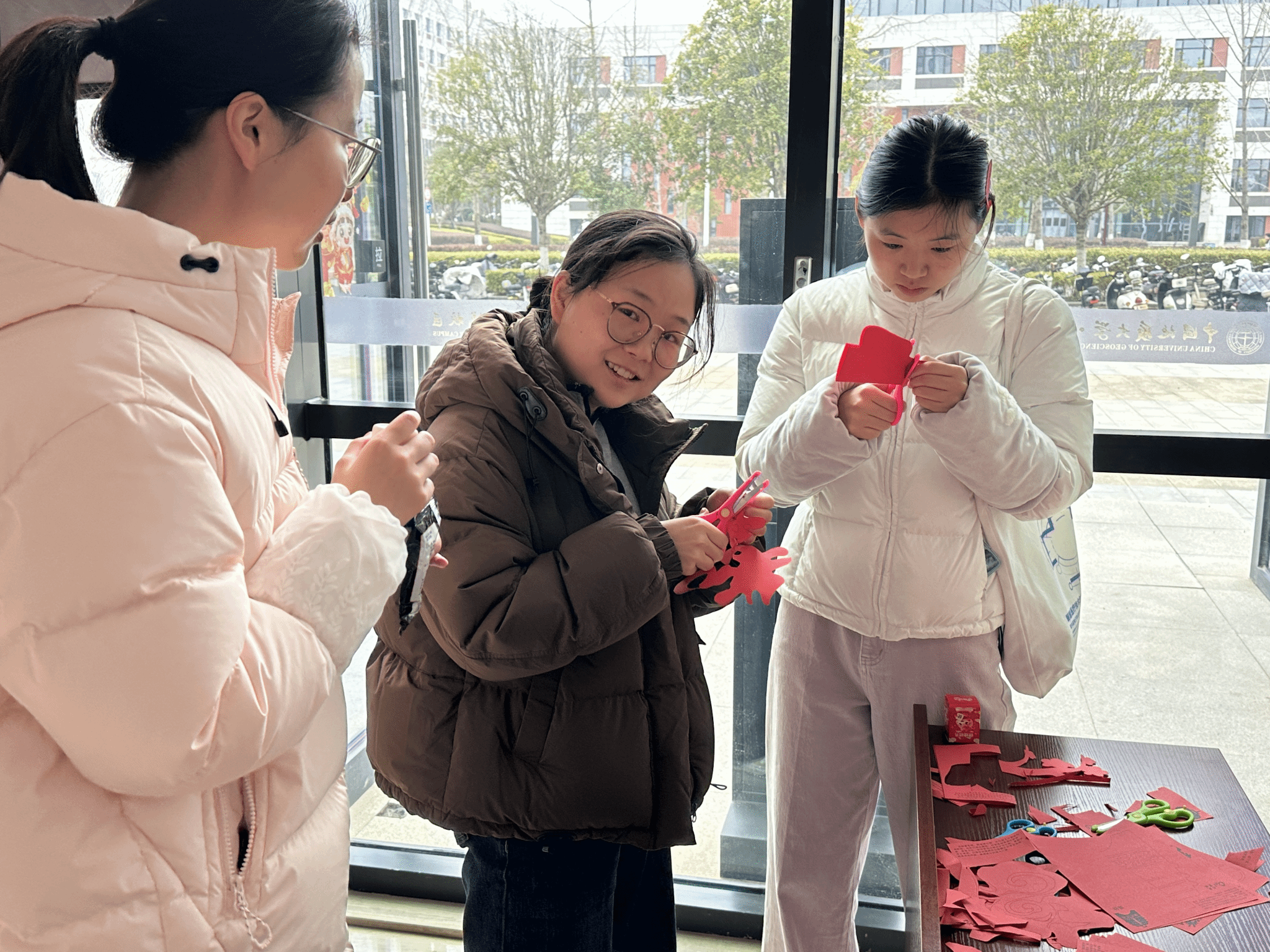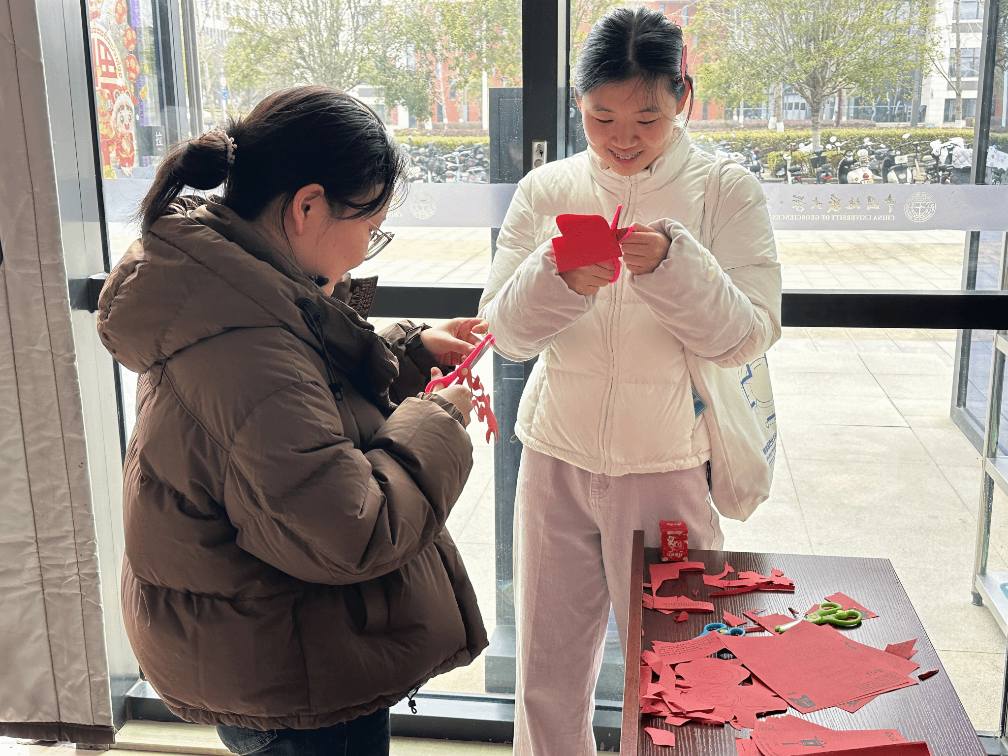 一张张喜庆的红纸在同学们手中几经折叠、剪裁,剪刀开合间,灵动的福字、精致的窗花、寓意吉祥的龙凤图案逐渐成型。现场既有老手娴熟运剪、佳作频出,也有新手虚心求教、稳步尝试,大家围坐交流技巧,分享创作灵感,红色纸屑纷飞间,不仅定格了手工制作的专注与快乐,更让非遗手工艺的独特韵味在互动中代代相传,每一件作品都承载着浓浓的年味与真诚的祝福。