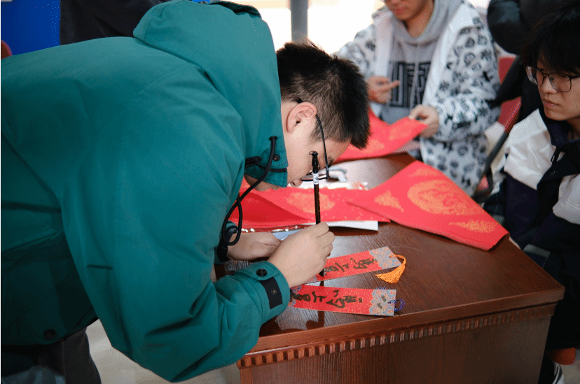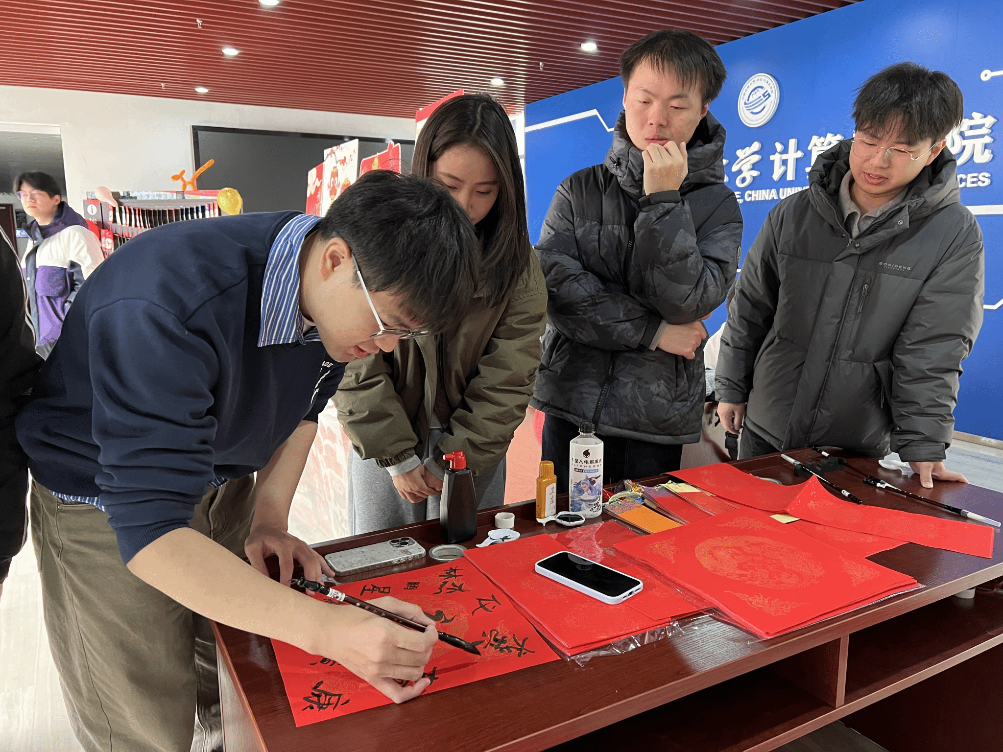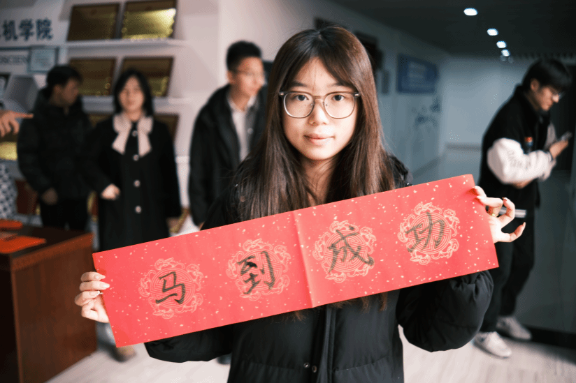 案几铺展红纸,笔墨早已备好,书法达人谭文博老师现场挥毫,笔走龙蛇间,兼具力量与美感的字迹跃然纸上。“代码无bug,科研步步高”“算力赋能,梦想启航”……同学们纷纷围聚,或求取专属定制的新春墨宝,或亲手执笔体验书写之趣。笔尖与纸面的摩挲声中,传统书法艺术的魅力悄然流淌,更将计科人的专业追求与新年期许巧妙融合,每一笔都饱含对新一年的热忱祈愿。