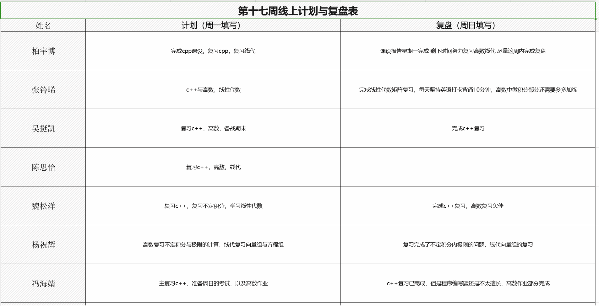 第17至19周,通过在线文档搭建“计划-执行-复盘”全流程学习管理平台,引导同学们自我管理,自主规划,明确每周核心学习目标与预计投入时长,周日详细反馈目标完成度、复习难点及收获心得。学风建设组每日提醒填写进度,检查记录质量,及时提供线上答疑支持,构建起“有规划、有追踪、有反馈”的闭环管理体系。