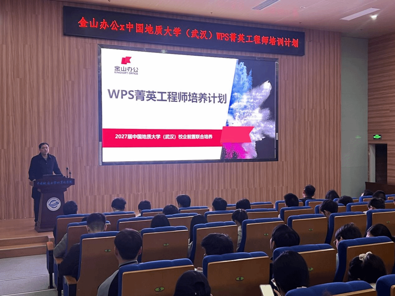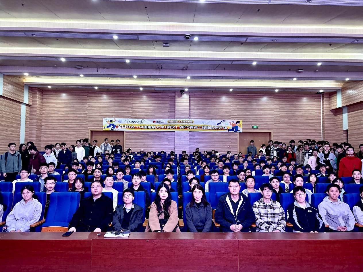 2026年3月12日下午,金山办公x中国地质大学(武汉)“WPS菁英工程师培养计划”开营仪式正式启动。金山办公研发培训院教学专家陈颢文、杨康康、刘壮怀(学院2015级网络工程专业毕业生),金山办公教育业务部项目经理许诺,学院党委副书记林小艳,学院研究生辅导员丁鑫磊及参训学员280余人参加。此次开营,是继双方成功合作后,在马年伊始对校企协同育人模式的进一步深化与升级。