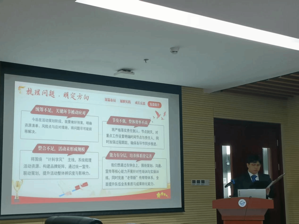 随后,团委学生会办公室、学风部以“以办筑基强效能,以学立品展风采”为主题进行述职。他们不断完善办公室运行机制,优化学风部活动流程,深刻反思统筹前置不足、节奏把控不强、品牌整合不够等问题,提出完善预案、节点管控、构建学风活动矩阵等改进措施,推动工作提质增效。